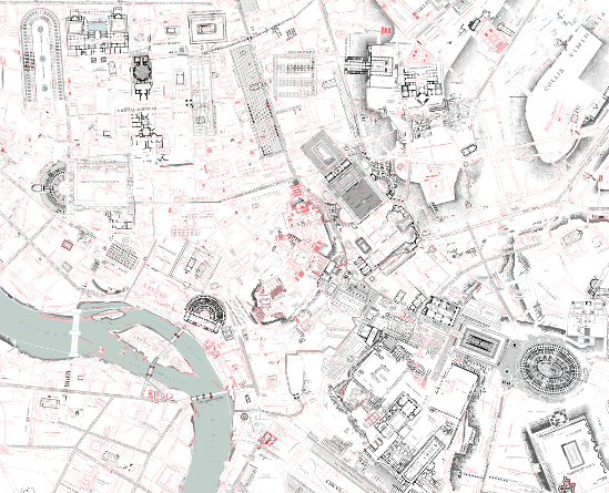 Our team has devoted parts of the last five years digitizing the entire 46 plates of Lanciani's Forma Urbis Romae, creating a layered, vector version of the map while carefully maintaining the graphic integrity and symbology of the original. We are currently working to perfectly amalgamate the plates, polishing the stylistic incongruences and correcting minor errors.
